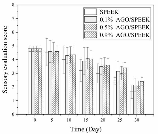 The sensory properties such as color, hardness, and overall acceptability of cherry tomatoes packaged with AGO/SPEEK films were determined during storage, and their results are presented in Figure 6. In general, cherry tomatoes were ranked almost similar with respect to their sensory properties; however, packaged cherry tomatoes had better peel color when the AGO content in the package was higher. Interestingly, cherry tomatoes packaged with 0.9% (w/w) AGO/SPEEK films maintained acceptable sensory scores even after 30 days of storage, showing the potential of AGO/SPEEK film in extending the shelf life.