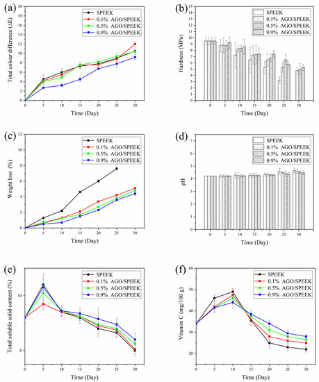 Physicochemical properties of AGO/SPEEK films in the storage of cherry tomatoes. (a) Total color difference, (b) hardness, (c) weight loss, (d) pH, (e) total soluble solid content, (f) vitamin C.