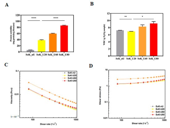 Solubility and rheological properties. (A) Protein solubility. (B) Water binding capacity (WBC). (C) Viscosity measurements at increasing shear rate. (D) Shear stress (σ) measurements at increasing shear rate of extracted proteins confirmed the non-Newtonian shear-thinning behavior of untreated and sonicated proteins. SoK_nU (untreated), Sok_U80 (ultrasonicated at 80 °C), Sok_U60 (ultrasonicated at 60 °C), and Sok_U20 (ultrasonicated at 20 °C). Statistical analysis was performed by one-way ANOVA; (*) p < 0.5, (**) p < 0.01, and (****) p < 0.0001. The data are represented as the means ± s.d. of three independent experiments.