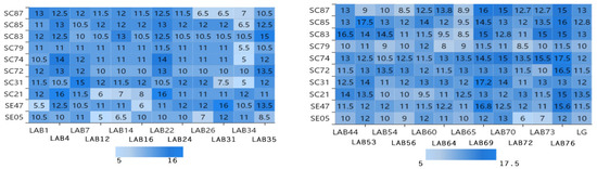 Figure 1 shows the inhibition results obtained for 10 different Salmonella strains by using the bacteriostatic circle method. Different Lactobacillus strains had different bacteriostatic effects on different Salmonella strains. The diameter of inhibition circle is less than 5 mm, which indicates that the bacteriostatic effect of lactic acid bacteria is not obvious. The diameter of inhibition circle is more than 8 mm, which indicates that lactic acid bacteria have bacteriostatic effect. The diameter of inhibition circle is more than 10 mm, which indicates that the bacteriostatic effect of lactic acid bacteria is obvious. From the Figure 1, the average inhibition zone diameter of the strains LAB1, LAB4, LAB7, LAB16, LAB22, LAB24, LAB35, LAB44, LAB53, LAB54, LAB56, LAB60, LAB64, LAB69, LAB70, LAB73, LAB76, and LG were more than 8 mm and were selected. The inhibition zone of LAB69 (17.2 mm) and LAB76 (17.5 mm) is the largest, indicating that the antibacterial effect is the best.