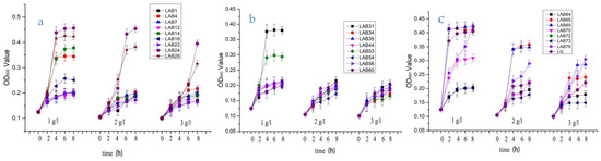 The bile salt tolerance of 24 strains of Lactobacillus. Note: (a)-The growth of 8 strains of Lactobacillus (LAB1, LAB4, LAB7, LAB12, LAB14, LAB16, LAB22, LAB24) under the condition of 1 g/L, 2 g/L, 3 g/L bile salt concentration for 8 h; (b)-The growth of 9 strains of Lactobacillus (LAB26, LAB31, LAB34, LAB35, LAB44, LAB53, LAB54, LAB56,LAB60) under the condition of 1 g/L, 2 g/L, 3 g/L bile salt concentration for 8 h; (c)-The growth of 8 strains of Lactobacillus (LAB64, LAB65, LAB69, LAB70, LAB72, LAB73, LAB76, LG) under the condition of 1 g/L, 2 g/L, 3 g/L bile salt concentration for 8 h.