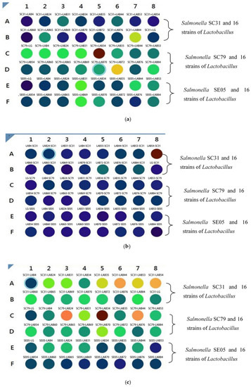 On the contrary, the fluorescence intensity was weaker, and the color was blue, indicating that the number of Salmonella adhered to Caco-2 cells was less. Adding Lactobacillus and Salmonella labeled with fluorescence to Caco-2 cells can show the change of fluorescence intensity. The changes of cell adhesion of Lactobacillus and Salmonella in different treatments were studied by color change. In the competition experiment, Lactobacillus and Salmonella were added to Caco-2 cells at the same time. The results showed that Salmonella in SC31-LAB84, SC79-LAB34 and SC79-LAB72 groups adhered more to Caco-2 cells than other groups (Figure 4a). In the rejection experiment, Caco-2 cells were incubated with Lactobacillus for 1 h, and then incubated with Salmonella (Figure 4b). The results showed that Salmonella had more adhesion to Caco-2 cells in LAB54-SC31 group. In other treatments, Lactobacillus adhered more to Caco-2 cells. In the substitution experiment (Figure 4c), Caco-2 cells were incubated with Salmonella for 1 h, and then incubated with Lactobacillus. The results showed that seven groups of treatments (SC31-LAB35, SC31-LAB44, SC31-LAB53, SC31-LAB54, SC79-LAB24, SC79-LAB34, and SC79-LAB44) had stronger fluorescence intensity, and indicated more Salmonella adhesion to Caco-2 cells. While the adhesion rate in other groups was inhibited by Lactobacillus, based on the color change.