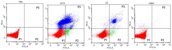 Apoptosis was detected using flow cytometry (CytoFLEX LX, BECKMAN, USA). Propidium iodide (PI) is a type of nucleic acid dye. Under normal circumstances, PI cannot penetrate the entire cell membrane; this is not true for mid- and late apoptotic as well as dead cells, the cell membrane of which PI penetrates and dyes the nucleus red. Caco-2 cells treated with PBS were used as blank control group, multidrug resistant Salmonella SC79 was used as negative control group, and standard Lactobacillus strain LG was used as positive control group. Figure 5 shows the four quadrant method to observe the apoptosis of Caco-2 cells, that is, the scatter plot of bivariate flow cytometry. In the Figure 5, P1 gate showed the ratio of living cells, which shows the number of living cells detected by flow cytometry after Caco-2 cells were incubated with different bacteria. Compared with the blank control group, the number of Caco-2 cells in LAB69 group and LG group were significantly increased, while the number of Caco-2 cells in LAB69 group was higher than that in the positive control group; the number of Caco-2 cells in the negative control group was significantly decreased. P2 gate and P3 gate show the apoptotic and dead cells detected by flow cytometry after Caco-2 cells were incubated with different bacteria. Compared with the blank control group, the number of apoptotic cells and dead cells of Caco-2 cells in LAB69 group and LG group decreased, and the number of apoptotic cells and dead cells in LAB69 group was lower than that in the positive control group; while the number of apoptotic cells and dead cells in Caco-2 cells in SC79 group increased significantly. As can be seen from Figure 5, compared with the blank control group, the results of Caco-2 cells incubated with different bacteria were significantly different. The invasion and destruction of Caco-2 cells in Salmonella negative control group were more serious, Compared with positive control group LG and LAB69, the number of live cells increased and the number of dead cells decreased. These results indicate that LAB69 has a certain protective effect on Caco-2.