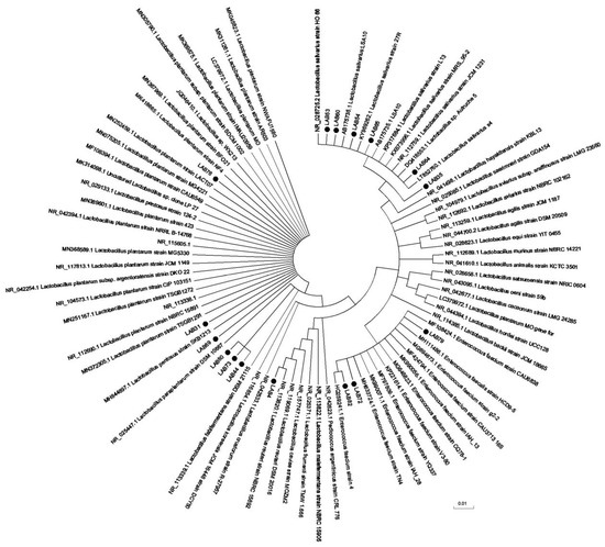 Neighbor-joining phylogenetic tree based on 16 S rRNA gene sequences showing relationship between Lactobacillus isolates.