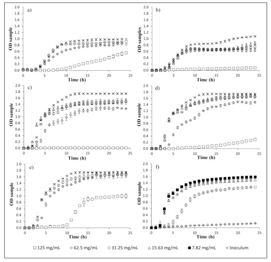 Growth curves were performed using MIC, ½ of MIC, ¼ of MIC, and ⅛ of MIC to better understand the effect of the extracts on each bacteria. Figure 1 shows the inhibition curves observed for S. aureus (OH 70 °C and 500 MPa), S. enteritidis (OH 70 °C, 500 MPa, and the combination of both), and B. cereus (500 MPa). The growth of the three bacteria was significantly affected by each extract, at least at MIC and 1/2 MIC. Antimicrobial activity is dependent on the specific bacteria, and polyphenols have been associated with this activity. The position of the OH group in the aromatic ring of polyphenols and the length of the saturated side chain may cause an inhibitory action in bacteria [25]. These hydroxyl groups can degrade bacteria cell membranes, leading to lysis and the release of cellular content. Additionally, metabolic pathways of bacteria may also be destroyed by hydroxyl groups, which may act in the active site of enzymes [25].