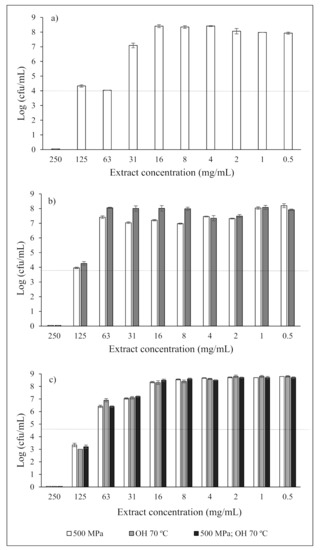 Figure 2 shows the microbiological loads for B. cereus, S. aureus, and S. enteritidis for the different extract concentrations analyzed, for an incubation time of 24 h, and for the extractions performed at OH 70 °C, 500 MPa, and the combination of both. For B. cereus and S. aureus, counts at MIC concentrations were higher than the initial load of each microorganism added to the extracts since these loads were not visually detected during observation. The method used in our study to find all MIC was visual observation, which is not as accurate as the spectrophotometric method. Sometimes, visual observation does not perceive the turbidity caused by cellular growth when microbial loads are low, but these can be detected spectrophotometrically. For the highest concentrations tested (250 mg/mL), all samples led to significant reductions, leading to bacterial death (MBC), with only the HP extract causing bacterial reductions for the three bacteria.