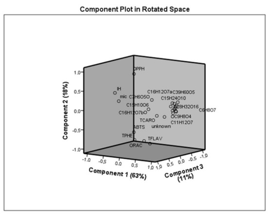 Principal component analysis (PCA) of data, where ABTS, DPPH, ORAC, TFLAV, TPHE, TCARO, IH, and MIC mean total antioxidant activity measured by ABTS, DPPH, and ORAC methods, total flavonoids, total phenolics, total carotenoids, inhibition halos, and minimum inhibitory concentration, respectively. Individual compounds are identified by their chemical formula.