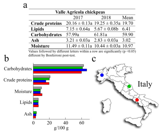 (a), nutritional values of Valle Agricola chickpeas collected in the years 2017 and 2018. Values are means (±SD) of triplicate analyses (n = 3) and are expressed on dry-weight basis (g/100 g). (b), average values of Valle Agricola chickpeas seeds (■) compared with those of common Italian chickpeas reported by the Centro di Ricerca per gli Alimenti e la Nutrizione (■), and with Merella (■) and Alta Valle di Misa (■) Italian chickpeas grown in Piemont and Marche regions. (c), geographic localization of Merella (⬤) and Alta Valle di Misa (⬤) chickpeas, grown in Piedmonte and in Marche, two northern and central Italian regions, respectively, while in red (⬤) geographical position of Valle Agricola town (Southern Italy).