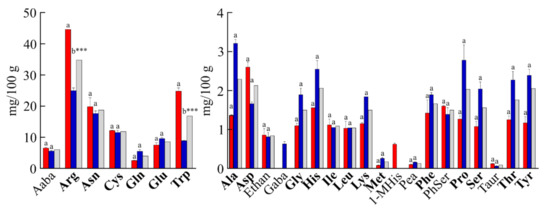 Free amino acid composition of Valle Agricola chickpeas. Values are means (± SD) of triplicate analyses (n = 3) and are expressed on dry-weight basis (mg/100 g). Valle Agricola chickpea seeds were collected in the years 2017 (red) and 2018 (blue), in grey the average values. Protein amino acids are highlighted in bold. Code for non-protein amino acids: Aaba, α-Aminobutyric acid; Ethan, ethanolamine; GABA, γ-aminobutyric acid; 1-MHis, 1-methyl-L-histidine; Pea, phosphorylethanolamine; PhSer, phosphoserine; Taur, L-taurine. Different letters (a, b) indicate a significance difference among levels of free amino acids (p < 0.05) by Bonferroni post-test. *** indicates significant difference at p < 0.001.