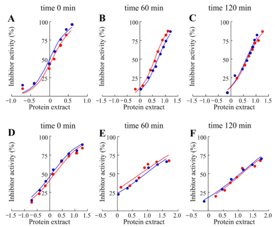 Inhibition curves of trypsin and α-chymotrypsin by raw soluble protein extract obtained from Valle Agricola chickpeas (A, D, respectively) or cooked Valle Agricola chickpeas at 60 (B, E, respectively) and 120 min (C, F, respectively). Increasing concentrations of raw protein extract were added to a fixed concentration of enzymes as indicated in Material and Methods. (⬤) and (⬤), seeds collected in 2017 and 2018, respectively.