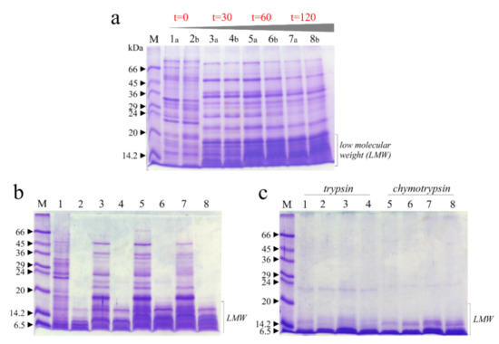 In this framework, in Figure 5a is reported as reference the SDS-PAGE profile of raw soluble chickpea protein extracts with and without thermal treatment boiling samples at 0, 30, 60 and 120 min, in which it is evident that the thermal treatment changed the profile of protein bands and increased the quantity of low molecular weight (LMW) bands. Subsequently, pepsin digestion displays that most of the extract is hydrolyzed in acid conditions (Figure 5b), with residual LMW bands, present in higher amount when samples were treated for longer times (Figure 5b). The same LMW bands disappeared when samples were pretreated with pepsin and then subjected to chymotrypsin or trypsin digestion (Figure 5c).