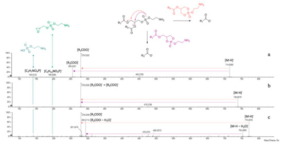 Taking into account literature data, compounds 1–3 were tentatively identified as glycerophosphatidylethanolamine (PE) derivatives (Table 3). In fact, negative mode ESI-MS/MS spectra showed two characteristic product ions at m/z 140.0122 and 196.0380, corresponding to 2-aminoethyl hydrogen phosphate ([C2H7NO4P]−) and 2-aminoethyl (oxiran-2-ylmethyl) phosphate ([C5H11NO5P]−) moieties, respectively (Figure 6).