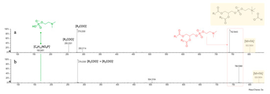 In negative ion mode mass spectrometry experiments, they were previously described as adducts with the counter ion [43], which in the present discussion is represented by formate anion. The ion at m/z 168.0450(1), corresponding to a 2-(dimethylamino)ethyl hydrogen phosphate structure ([C4H11NO4P]−), was pivotal to further confirm the polar head group of phosphatidylcholine. The fragmentation pathway of these molecules provided at first the loss of the counter ion and of an additional N-methyl group, giving rise to the corresponding dimethyl-phosphatidylethanolamine derivatives (at m/z 742.5443 and 766.5360 for compounds 4 and 5, respectively).