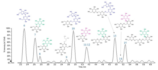 Compounds 6–15 were tentatively identified as carbohydrate derivatives. Their elution order on the Luna Omega Sugar column was influenced by the number of saccharidic units, in that a higher number of units was directly translated in a greater retention time. Moreover, on an equal number of units, the presence of a cyclitol moiety implied a delay in the elution (Figure 8).