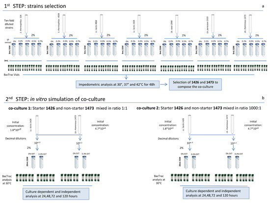 Experimental design. In the figure (a) the scheme of the strain selection precudure is reported, and (b) the schematic representation of the in vitro simulation of co-culture is reported.