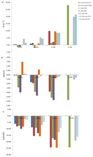 Graphical representation of the Δvalues of each parameter calculated as the difference from the control value 0%. In the figure: (a) ΔLag; (b) ΔRate; (c) ΔyEnd. On the X-axis, the spirulina extract concentrations are reported: 0.20%, 0.30%, 0.50%, and 0.70%.