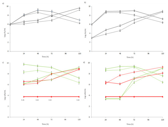 Enumeration of L. lactis 1426 (●) and Lb. rhamnosus 1473 (▲) cultivated in co-culture for 120 h in the presence (dotted lines) and absence (solid line) of 0.30% A. platensis extract. Plate counts of co-culture 1 (a) and co-culture 2 (b). Fluorescent microscopic counts of co-culture 1 (c) and co-culture 2 (d): the number of viable cellsare in green and in red are the number of dead cells (n.d.: not detected; the cells’ concentration was under the 3 Log cells/mL).
