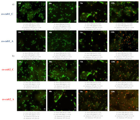 Fluorescence microscopy images of co-culture 1 (a) and co-culture 2 (b), with (co-Cult_A) and without (co-cult_C) 0.3% of antimicrobial A. platensis extract at four sampling time points: 24, 48, 72, and 120 h of incubation. Live cells labelled with Syto 9 appear in green, and dead cells labelled with propidium iodide (PI) appear in red. Scale bars are 5 μm in length. The Starter strain cells Lc. 1426 are round-shaped, while the non starter strain cells Lb. 1473 are rod-shaped.