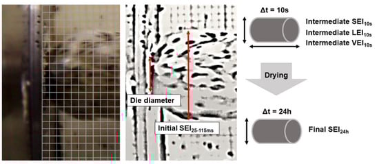 Typically, expansion is described by expansion indices that are measured and calculated based on the diameter and length of the extrudate in sectional and longitudinal directions without relating it to the time of measurement. The sectional expansion index (SEI) describes the radial growth of the extrudate, the longitudinal expansion index (LEI) describes axial growth and the volumetric expansion index (VEI) is a combination of growth in the radial and axial directions []. However, when the properties of extruded products were characterized in previous studies, often only the final SEI was reported and only a few studies, mainly using modeling techniques, investigated extrudate growth and shrinkage separately [,].