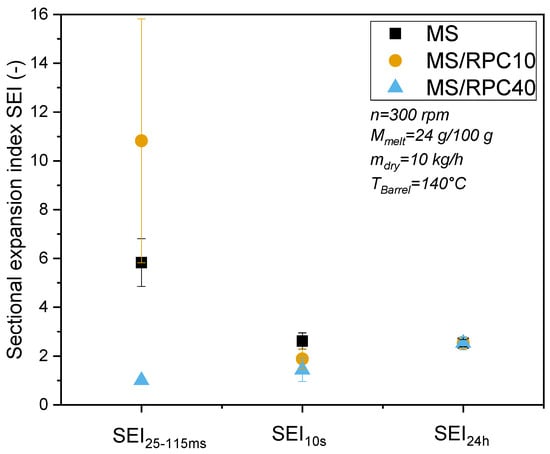 The effect of fibers on sectional expansion appears to be concentration dependent and strongly influenced by the applied process conditions []. In previous studies, the addition of fiber to materials with a low moisture content resulted in the significant restriction of final sectional expansion. However, when the moisture content was higher (>20 g/100 g), as in the current study, the presence of fibers in the blends had a limited effect on the final expansion ratio []. The similar SEI24h of MS and RPC blends supports these findings. The large SEI25–115ms of MS/RPC10 extruded at TBarrel = 140 °C was accompanied by a lower mechanical energy input, a lower product temperature and a higher pressure at the die compared to MS and MS/RPC40 (Section 3.4). An increase in pressure due to a lower SME and product temperature has been reported previously and may have encouraged the more pronounced initial radial expansion of MS/RPC10 [].
