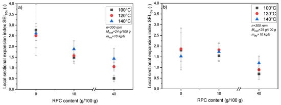 Figure 3 shows the impact of RPC on the SEI10s of MS and MS/RPC blends extruded with a moisture content of 24 g/100 g (Figure 3a) or 29 g/100 g (Figure 3b). MS achieved the highest SEI10s regardless of TBarrel whereas the addition of RPC caused the SEI10s to decrease. However, the SEI10s of MS declined as the moisture content increased, whereas the moisture content had a negligible effect on the SEI10s of blends containing RPC. In the MS/RPC40 blend, the SEI10s increased along with the TBarrel and the effect was more pronounced at the lower moisture content. A similar phenomenon was observed for MS/RPC10 when the moisture content was 24 g/100 g. The variability of SEI10s for MS extruded at TBarrel = 100 °C can be attributed to the irregular oscillating surface of the extrudates. This effect has been described as the “shark skin” phenomenon and can be attributed to stick-slip mechanisms between the melt and the inner surface of the die.