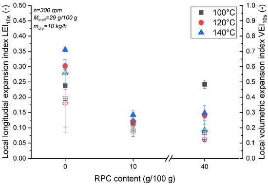 Effect of the barrel temperature (TBarrel = 100, 120 or 140 °C) and rapeseed press cake (RPC) content (0, 10 or 40 g/100 g (w.b.)) on maize starch (MS) extruded at 29 g/100 g (d.m.) moisture content. RPC is plotted against intermediate longitudinal expansion (LEI10s, filled symbols) and intermediate volumetric expansion (VEI10s, empty symbols).