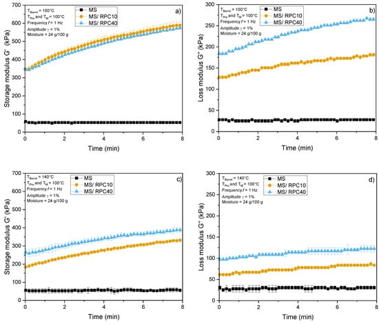 Storage modulus G’ (a,c) and loss modulus G’’ (b,d) (kPa) as a function of treatment time (min), pre-treatment and measurement temperature (TPre, TM) of maize starch (MS) and maize starch blended with 10 or 40 g/100 g (w.b.) rapeseed press cake (RPC) rehydrated to a moisture content of 24 g/100 g (d.m.). The samples were extruded at a moisture content of 24 g/100 g (d.m.) and barrel temperatures (TBarrel) of 100 or 140 °C.