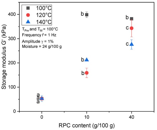 Storage modulus G‘ (kPa) after 1 min treatment time (TT) as a function of rapeseed press cake (RPC) content (0, 10 or 40 g/100 g (w.b.)) and barrel temperature (TBarrel = 100, 120, 140 °C) of extruded maize starch (MS) blends. Samples extruded and rehydrated to 24 g/100 g (d.m.) moisture content; pre-treatment and measurement temperature (TPre, TM) 100 °C. Mean values with different superscript letters indicate significant differences (p < 0.05) based on a one-way analysis of variance (ANOVA). Means were compared using Tukey’s honest significance test.