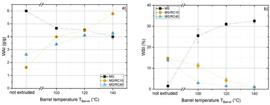The water absorption and water solubility indices (WAI and WSI) of non-extruded and extruded starch and starch/RPC blends are compared in Figure 7. The WAI and WSI of starch-based blends were highly dependent on the extrusion process conditions. Overall, the WAI of all samples was relatively low. The WAI of MS was highest for the non-extruded samples and decreased with increasing TBarrel, whereas the WSI was lowest for the non-extruded samples and increased with increasing TBarrel. The WAI and WSI of RPC blends showed the opposite trend. The WAI of RPC blends was low for the non-extruded samples and increased with increasing TBarrel, whereas the WSI was highest for the non-extruded samples and declined with increasing TBarrel. These effects probably reflect the presence of rapeseed fiber and protein in the RPC blends as discussed in Section 4.4.