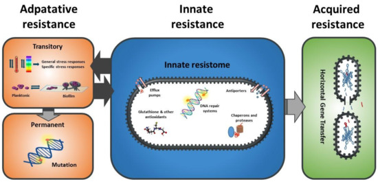 As described for antimicrobial resistance, the mechanisms of bacterial resistance to any stress can be classified as innate, adaptive, or acquired [17] (Figure 2). Innate mechanisms include all those structures and potential processes already present and/or active in the bacterial cell when it faces the stressing agent, i.e., they are constitutively and almost continually expressed. Such innate resistance mechanisms include key structures such as the cell envelope robustness, basally expressed homeostatic mechanisms (including membrane pumps, antioxidants, enzymes such as peroxidase, etc.), and damage repair systems (e.g., chaperons and proteases). In the scientific literature, these innate resistance mechanisms are called “classical determinants”. Adaptive resistance includes those genotypic and phenotypic changes arising as a consequence of the exposure of bacterial cells to a given environmental stress. Some examples of adaptive resistance mechanisms include changes in cell permeability, overexpression of protective shock proteins, induction of changes in the targets of stressing agents, and also VBNC, biofilm, and persister development [17,18]. Such changes are generally transient: once the stress ceases, they revert. On certain occasions, however, these phenotypic changes become permanent, for instance, through mutation. Moreover, under stressing conditions, a certain decrease in DNA replication consistency may be essential to produce a more heterogeneous population so that some members possessing the new genes or gene combinations can better survive adverse reigning conditions. This process has been described as adaptive or directed mutation. The mechanisms underlying it include stress-induced errors during DNA synthesis, suppression of normal DNA repair checking and repair mechanisms, transient hypermutability, gene amplification, and stress-induced recombination processes [19]. In addition, bacteria can also increase their resistance to stress through horizontal gene transfer, which can be termed as acquired resistance [18].