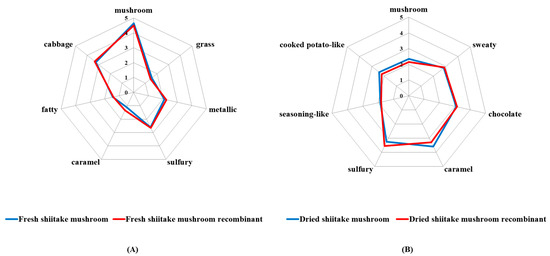 All odorants with OAVs ≥ 1 were prepared by mixing them in water solution at their actual concentrations determined in the fresh and hot-air-dried shiitake mushrooms. Then the solution was added to the deodorized matrix, which was prepared using the method of Zhang et al. [20]. Subsequently, the recombination samples, the fresh and hot-air-dried shiitake mushrooms, were each placed in closed, odorless plastic vessels and evaluated by the panelists as explained in Section 2.13.