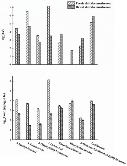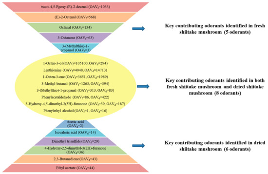 On the basis of OAV ≥ 1, 3-methyl-butanal (chocolate), octanal (citrus-like), (E)-2-octenal (fatty, nutty), phenylacetaldehyde (floral), trans-4,5-epoxy-(E)-2-decenal (metallic), 3-octanone (mushroom), 1-octen-3-one (mushroom), 3-(methyl-thio)-1-propanal (cooked potato-like), 3-(methyl-thio)-1-propanol (cabbage), lenthionine (sulfury, burnt), 1-octen-3-ol (mushroom), phenylethyl alcohol (honey) and 3-hydroxy-4,5-dimethyl-2(5H)-furanone (seasoning-like) were considered to be the key contributors to the aroma of fresh shiitake mushrooms, and ethyl acetate (pineapple), 3-methyl-butanal (chocolate), phenylacetaldehyde (floral), 2,3-butanedione (sweet, creamy), 1-octen-3-one (mushroom), dimethyl trisulfide (sulfury), 3-(methyl-thio)-1-propanal (cooked potato-like), lenthionine (sulfury, burnt), 1-octen-3-ol (mushroom), acetic acid (vinegar-like), isovaleric acid (sweaty), phenylethyl alcohol (honey), 3-hydroxy-4,5-dimethyl-2(5H)-furanone (seasoning-like) and 4-hydroxy-2,5-dimethyl-3(2H)-furanone (caramel) were detected as the key contributing odorants in the dried shiitake mushrooms.