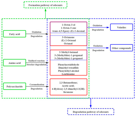 Moreover, there were an additional six key contributing odorants detected in shiitake mushrooms after drying, including ethyl acetate (pineapple), 2,3-butanedione (sweet, creamy), dimethyl trisulfide (sulfury), acetic acid (vinegar-like), isovaleric acid (sweaty) and 4-hydroxy-2,5-dimethyl-3(2H)-furanone (caramel). This is the reason for the increase in sulfury, caramel-like and sweaty characteristics of the aroma after drying (Figure 1B). These compounds might be generated from fatty acids by oxidation or degradation, amino acids by Maillard reaction or Strechker and polysaccharides by caramelization or degradation (Figure 3). For example, 4-hydroxy-2,5-dimethyl-3(2H)-furanone could be formed via carbohydrate degradation reactions [50] and 2,3-butanedione and acetic acid were formed via caramelization reactions [21,51].