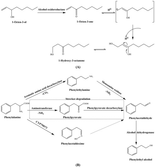 Main pathways involved in the degradation of 1-octen-3-ol (A) and the formation of phenylethyl alcohol (B) in shiitake mushrooms during drying.