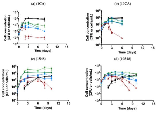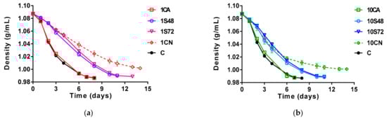 The fermentation kinetic profiles obtained under the different inoculation conditions, measured as must density reduction, are shown in Figure 1. The fastest fermentations were those with single inoculation with Sc and with the coinoculation of all the strains at the same time (1CA and 10CA), which showed similar fermentation profiles and completed fermentations in 7–8 days (10CA completed the fermentation 1 day earlier than that of Sc alone (C)). The fermentation kinetics were less affected by the inoculum concentration of non-Saccharomyces yeasts but were influenced by the inoculation time of Sc. The sequential inoculations, in which only non-Saccharomyces strains were fermented for 48–72 h, resulted in slower fermentations, finishing all the sugars in 11 (1S48, 10S48, 10S72) or 13 days (1S72) (Figure 1). These fermentations were slightly slower when Sc was inoculated later, at 72 h, mainly in the lower non-Saccharomyces inoculum (1S72). Finally, fermentations with only non-Saccharomyces species (1CN and 10CN) showed the slowest fermentation kinetics, getting stuck on the 13th day, at densities of 1.002 and 1.001 g/mL, respectively (Figure 1a,b). In general, the fermentations with non-Saccharomyces strains inoculated at 107 cells/mL showed slightly faster fermentation kinetics than did those inoculated at 106 cells/mL (Figure 1a,b).