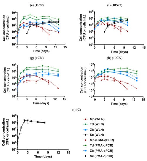 ), determined in the different fermentative conditions: non-Saccharomyces multistarter coinoculated with (a,b) and without (g,h) S. cerevisaie (Sc); non-Saccharomyces multistarter with sequential inoculation of Sc at 48 h (c,d) or 72 h (e,f) and the single Sc fermentations (i). The initial non-Saccharomyces inoculum size was 106 cells/mL (a,c,e,g) and 107 cells/mL (b,d,f,h). Each species is shown in different colors (Mp in red, Td in green, Zb in blue and Sc in black).