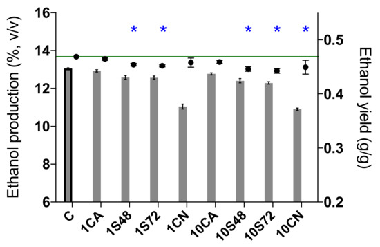 Ethanol production (%, v/v) and ethanol yield (g/g) at the end of single and mixed fermentations. * indicates statistically significant differences from the control sample (C) (LSD (least significant difference) test, p < 0.05). The value of the green line is 0.47 g/g (ethanol yield of C). 1CN and 10CN were stuck fermentations.