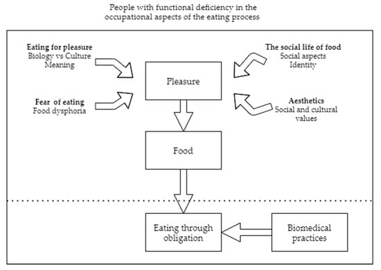 As Cavalieri [23] has noted, humans are the only beings who have transformed a physiological need into a pleasurable cultural experience, laden with meaning. Food can be a great source of pleasure, not only through its consumption, but also during its acquisition and preparation [24]. However, certain difficulties caused by health conditions might hinder the experience of food-derived pleasure.