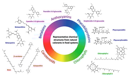 Representative chemical structures from the most common types of natural colorants applied in food systems. The chemical structures were downloaded from https://pubchem.ncbi.nlm.nih.gov (accessed on 21 February 2021). Chemical structures from phycobiliproteins were adapted from Hsieh-Lo et al. [16] with permission of Elsevier or applicable copyright owner.