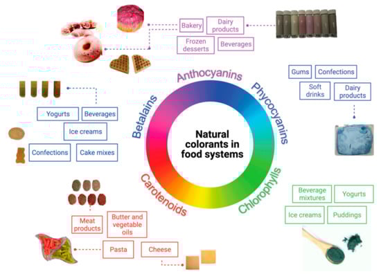 Several food colorants have been isolated from diverse sources to be applied in food systems. An overview of some of the most important food systems in which natural colorants are applied is presented in Figure 2.