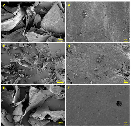 Field emission scanning electron microscopy (FESEM) data of chitin and chitosan samples. Images of mealworm chitin (A,B) (×300 and ×10,000), shrimp chitin (C,D) (×300 and ×10,000), and mealworm chitosan (E,F) (×300 and ×10,000).