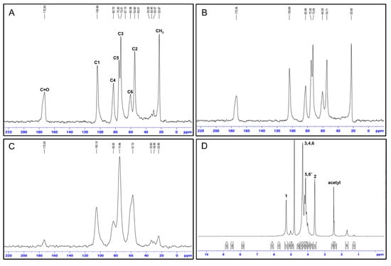 Nuclear magnetic resonance (NMR) data of chitin and chitosan. 13C NMR data of mealworm chitin (A), shrimp chitin (B), and mealworm chitosan (C). 1H NMR data of mealworm chitosan (D).