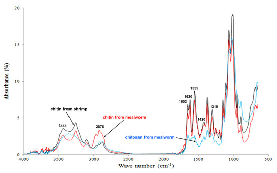 Common chitin products in industries constitute those originating from crustaceans such as shrimp and crab. Because of their tough textures and difficult digestion, their shells are dumped as waste; therefore, this waste is typically used for preparing chitins. Chitin and chitosan can be employed as therapeutic agents, pharmaceutical carriers, and packaging materials as natural biopolymers [39]. When chitin was extracted from mealworm powder on a laboratory scale, its yield was 4.72 ± 0.21 g/100 g dried mealworm (Table 2). The extraction may have performed properly because this amount was similar to the total glucosamine content of the mealworms (4.84 ± 0.43%); moreover, its yield was analogous to that reported by Song et al. [40] (4.91%), but considerably lower than that reported by Siregar and Suptijah [41] (10–13%). In a subsequent study, the authors reported a high yield for chitin preparation; however, we found that the color of their chitin samples was darker, and the DA (70–80%) was significantly lower than that observed in the present study. Moreover, the authors reported a high nitrogen content, which indicated an incomplete deproteinization process; therefore, it was expected that their yield could also be decreased provided sufficient purification was performed. The yield of chitin from the mealworms was significantly lower than that obtained from crustacean sources such as shrimp (approximately 20%) and crab (30–40%) [22,42], and slightly lower than that obtained from imago edible insects such as grasshoppers (4.71–11.84%) or crickets (approximately 8.7%) [43,44]. The differences between these edible insects are attributed to their growth stages because grasshoppers and crickets are adult insects that have well-developed cuticles. However, the chitin yield of mealworms was higher than that of the silkworm pupa (one of the less developed edible insects with a chitin yield of 2.5–4.2%) [45,46]. The color values of mealworm chitin were 82.21 ± 0.72, 1.81 ± 0.08, and 8.68 ± 0.37 for lightness, redness, and yellowness, respectively, whereas the color values of chitin from the crabs were 55.4–62.4, 0.3–1.1, and 14.7–16.8 for lightness, redness, and yellowness, respectively [32]. As mealworm chitin had a significantly higher lightness value but lower yellowness, it could exhibit white color compared to the chitin originating from crabs. Similarly, the WI value of mealworm chitin (80.13 ± 0.81) was significantly higher than that of the chitin from crabs (43.9–59.6) [32], and its bright color can be potentially applicable in industries.