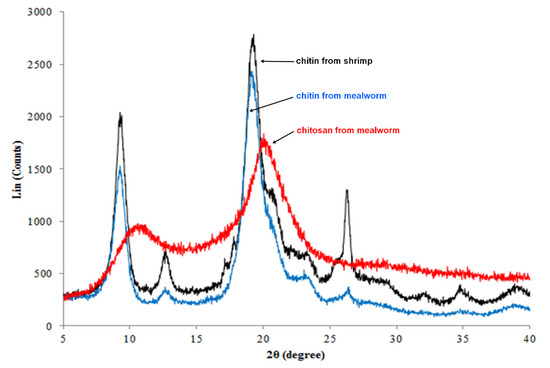 3.6. Determination of Crystalline Structures of Mealworm Chitin and Chitosan by XRD