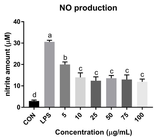 Nitric oxide reduction effects of mealworm chitosan on lipopolysaccharide (LPS)-stimulated murine macrophage cell line (RAW 264.7). Different superscripts (a–d) indicate significant differences at p < 0.05.