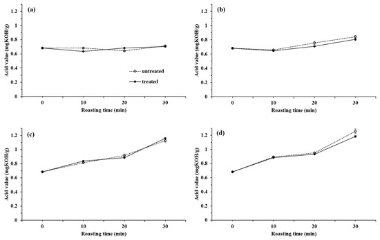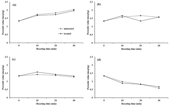 - Lee, S.W.; Jeung, M.K.; Park, M.H.; Lee, S.Y.; Lee, J. Effects of roasting conditions of sesame seeds on the oxidative stability of pressed oil during thermal oxidation. Food Chem. 2010, 118, 681–685. [Google Scholar] [CrossRef]