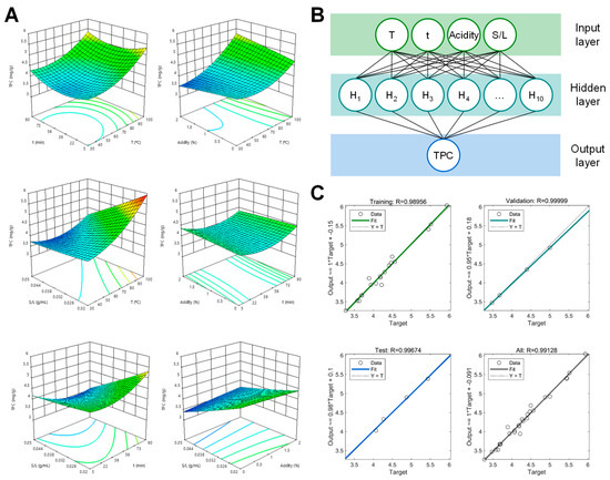 Representative 3D plots illustrating the behavior of total phenolic compounds (TPC) extraction (A). Responses (mg g−1) are graphed against two paired variables: T (temperature in °C), acidity (% citric acid), t (time in min) and S/L (solid:liquid ratio in g mL−1); the topology of the multilayer feed-forward neural network for TPC (B), and scatter plot between the experimental and predicted yield by artificial neural networks (ANNs) for training, validation, testing, and overall data fitting for TPC (C).