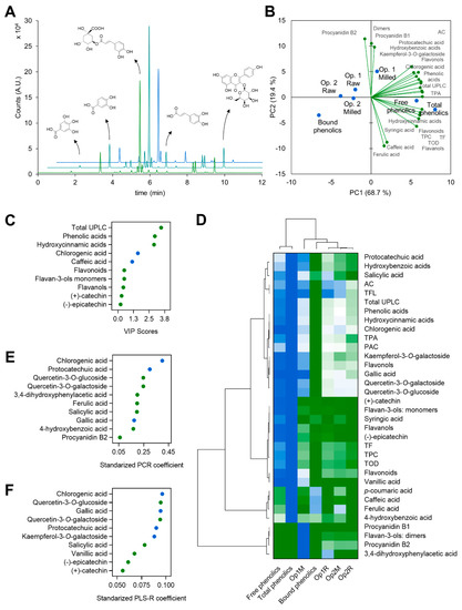 ) value for each parameter) (D) showing the associations among the measured parameters and classifying phenolic extracts from coffee husk according to them, and the ten most significant coefficients from principal components regression, PCR (E) and principal least squares regression, PLS-R (F). Circles in different colors indicate minor phenolic or phenolic family, green (