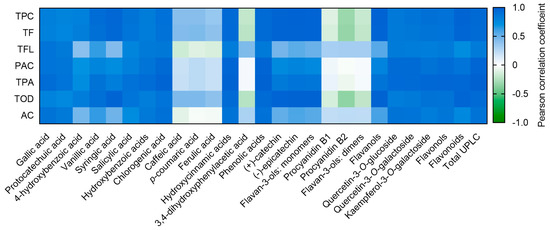 Heatmap depicting the Pearson correlation coefficients from the associations among in vitro determinations of phenolic families and the different phenolic compounds quantified using UPLC-ESI-MS/MS.