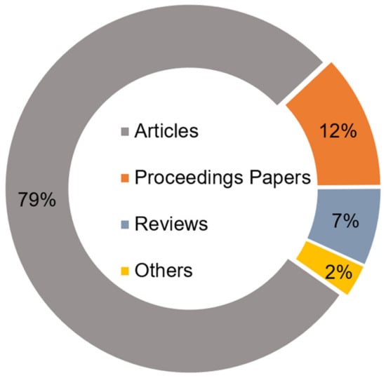 WoS was developed by Thomson Scientific, and it covers most scientific fields. It has a quick search, an advanced search, a general search, and a cited reference search, which it uses to compile the literature data set [35]. In this study, two types of keywords used for data collection were “food system$” or (food near/3 (produc* or proces* or transpor* or consump* or wast* or dispos*)) and “city or cites or urban* or downtown or metropolis.” Since there were very few studies on UFS before 1991, the publication years of 1991 to 2020 were chosen (the publication search was conducted in January 2021). Based on the retrieval method mentioned above, a total of 5674 publications were found to be in accordance with the selection criteria. The research results include all the essential publication information (including titles, keywords, abstracts, affiliations, authors, and references). Among these publications, according to categories within the WoS, periodical articles accounted for 78.8%, followed by proceedings papers (12.1%), and reviews (7.3%) (Figure 1). Since articles accounted for the largest share of the total document types, this study only contains articles, proceeding papers, and review papers applicable to our research goals. English (96.3%) is the most frequently used language, followed by Portuguese (1.3%). In this study, only publications in English are selected because of their academic popularity. The final database is composed of 5360 research publications.